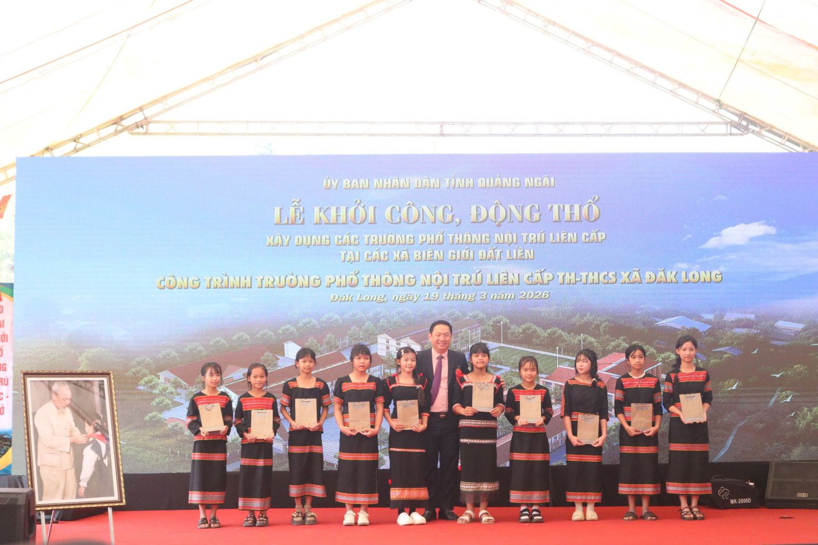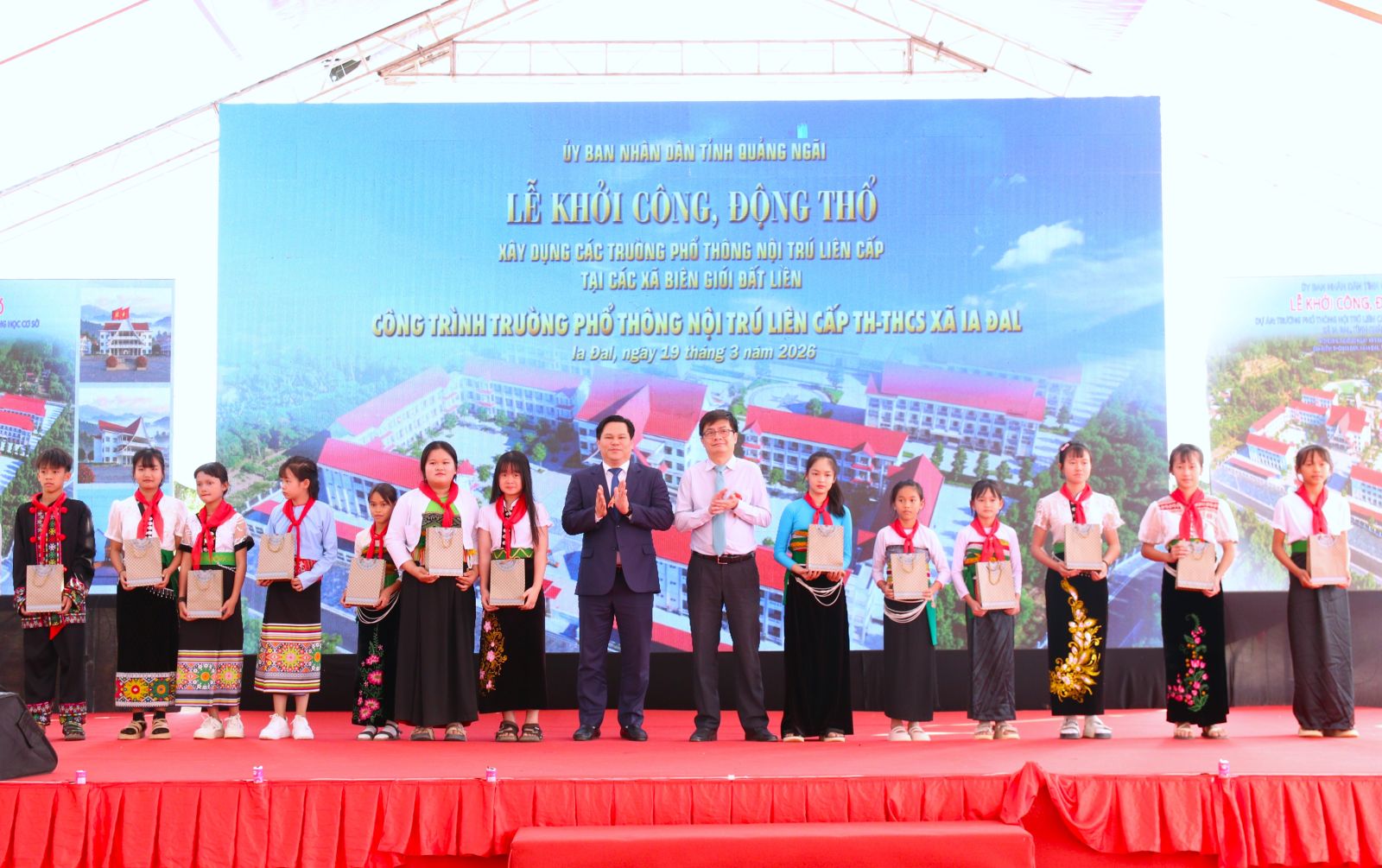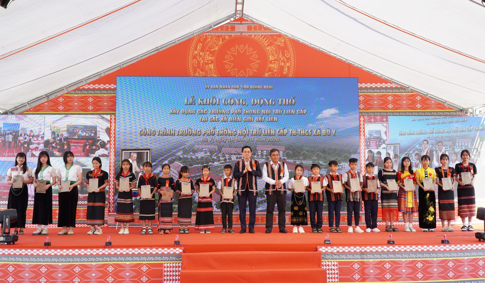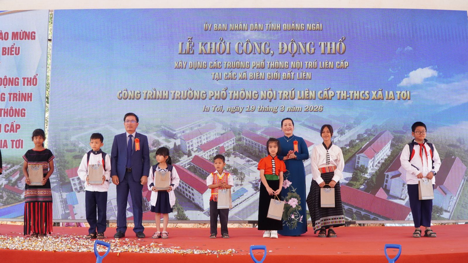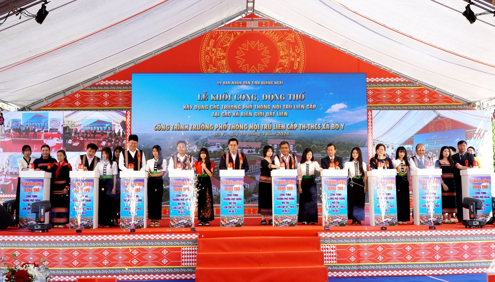 Trên phạm vi cả nước, trong ngày hôm nay có tổng cộng 121 công trình trường phổ thông nội trú liên cấp tiểu học – trung học cơ sở được đồng loạt khởi công tại 121 xã biên giới thuộc 17 tỉnh, thành phố. Riêng tại tỉnh Quảng Ngãi, trong đợt khởi công thứ hai năm 2026, có 5 trường học được khởi công tại các xã Bờ Y, Ia Đal, Ia Tơi, Đăk Plô và Đăk Long, với tổng mức đầu tư khoảng 1.100 tỷ đồng, quy mô 178 lớp học, dự kiến đáp ứng nhu cầu học tập cho khoảng 5.600 học sinh, trong đó phần lớn là học sinh dân tộc thiểu số.