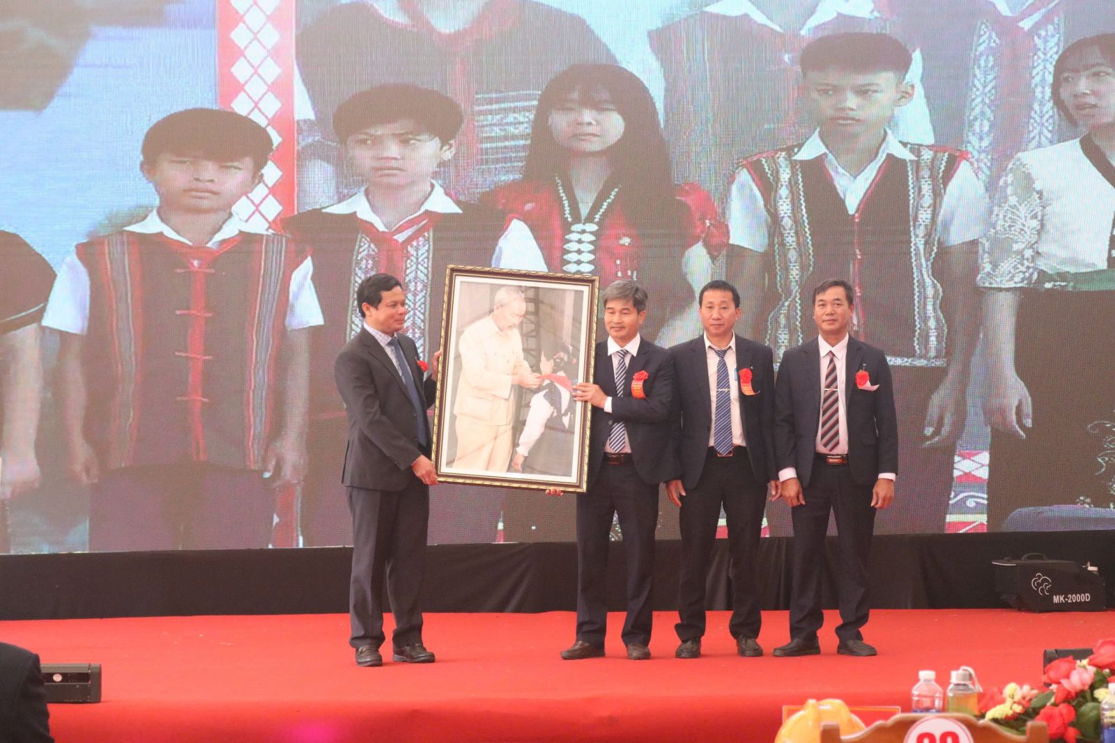 Ủy viên Trung ương Đảng, Bí thư Tỉnh ủy Hồ Văn Niên tặng trường phổ thông nội trú liên cấp Tiểu học – Trung học cơ sở xã Bờ Y bức tranh Bác Hồ đeo khăn quàng cho thiếu nhi