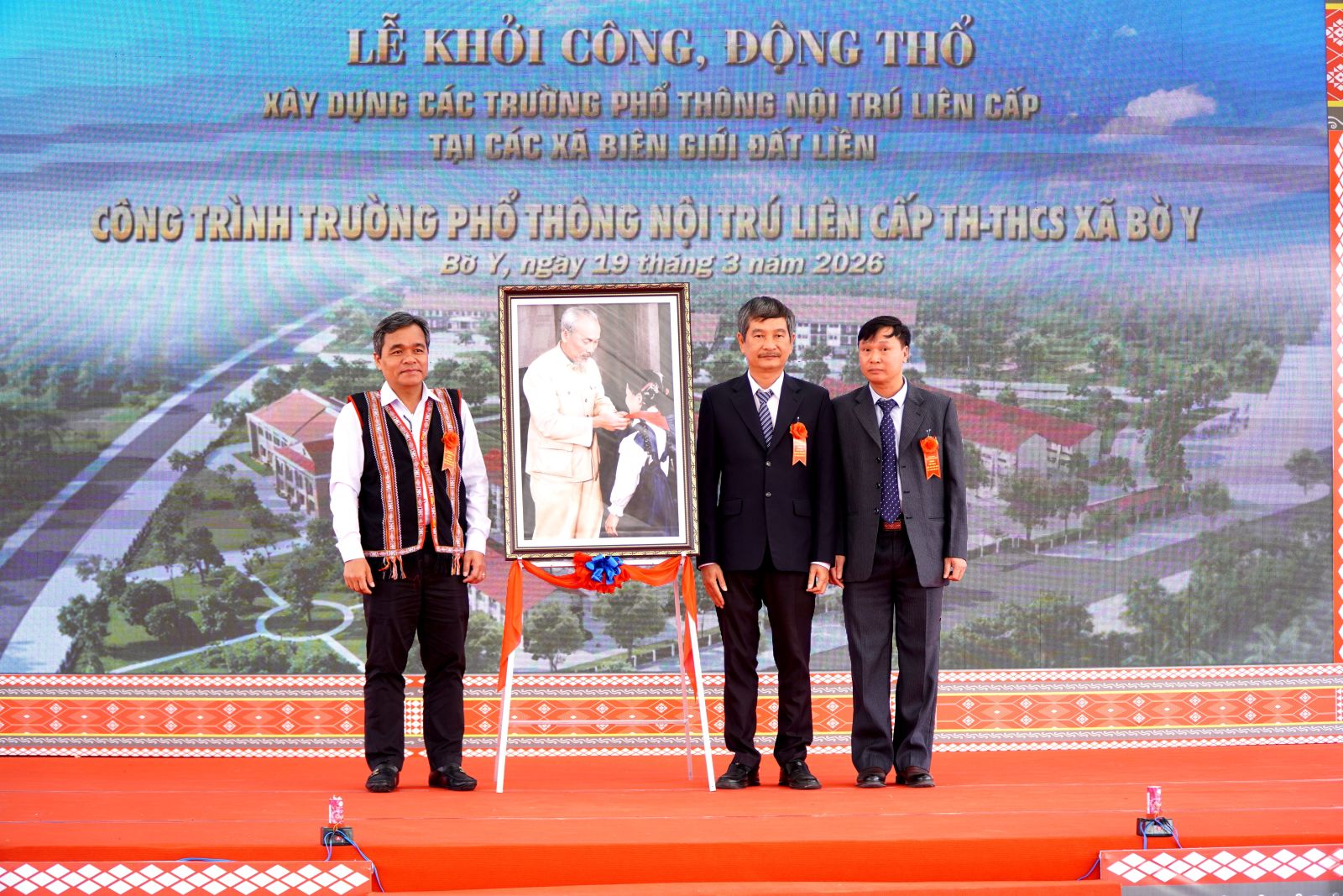 Tại buổi lễ, Ủy viên Trung ương Đảng, Bí thư Tỉnh ủy Hồ Văn Niên đã trao tặng trường phổ thông nội trú liên cấp Tiểu học – Trung học cơ sở xã Bờ Y bức tranh Bác Hồ đeo khăn quàng đỏ cho thiếu nhi.