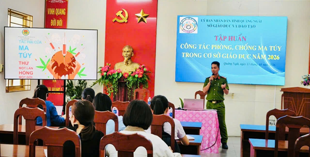 Sáng ngày 13/3/2026, Sở Giáo dục và Đào tạo Quảng Ngãi đã tổ chức lớp tập huấn “Phòng, chống ma túy trong cơ sở giáo dục” cho hơn 70 cán bộ, giáo viên cốt cán khu vực phía Tây tỉnh Quảng Ngãi.